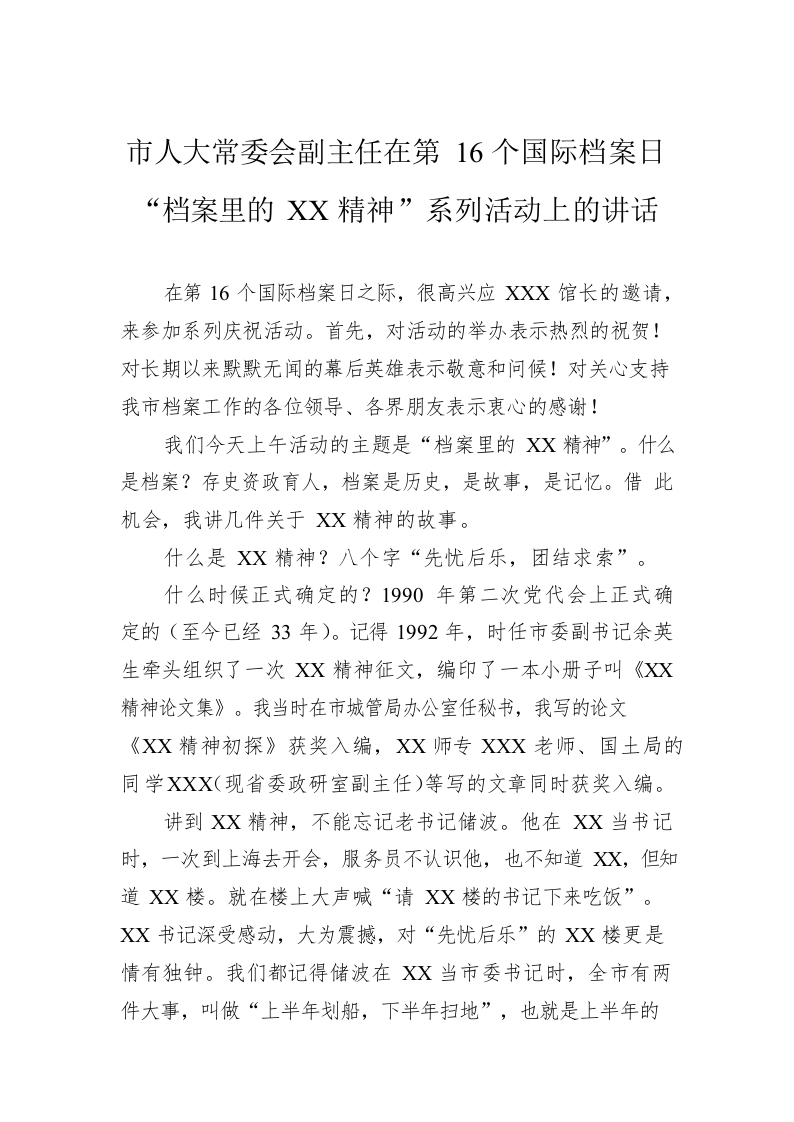 / 市人大常委会副主任在第16个国际档案日“档案里的XX精神”系列活动上的讲话