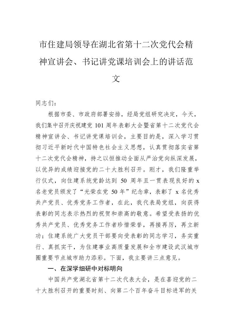 / 市住建局领导在湖北省第十二次党代会精神宣讲会、书记讲党课培训会上的讲话范文