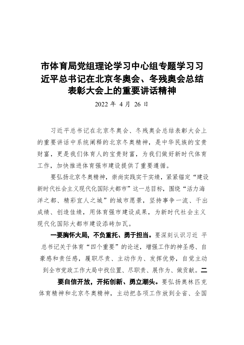 市体育局党组理论学习中心组专题学习习近平总书记在北京冬奥会、冬残奥会总结表彰大会上的重要讲话精神(20220426)