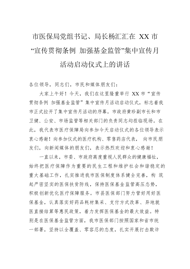 / 市医保局党组书记、局长杨汇汇在XX市“宣传贯彻条例 加强基金监管”集中宣传月活动启动仪式上的讲话