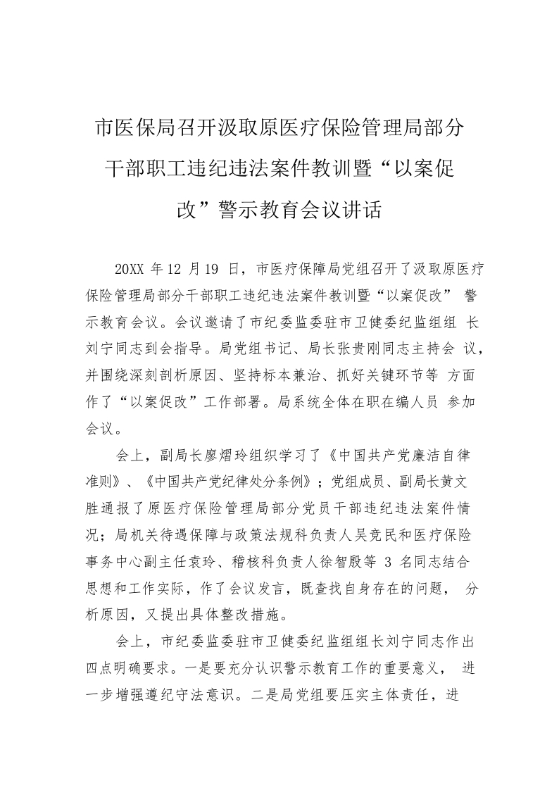 / 市医保局召开汲取原医疗保险管理局部分干部职工违纪违法案件教训暨“以案促改”警示教育会议讲话
