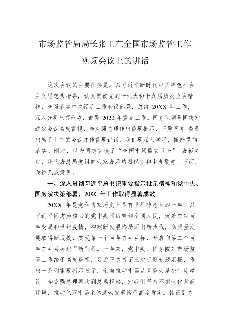 / 市场监管局局长张工在全国市场监管工作视频会议上的讲话