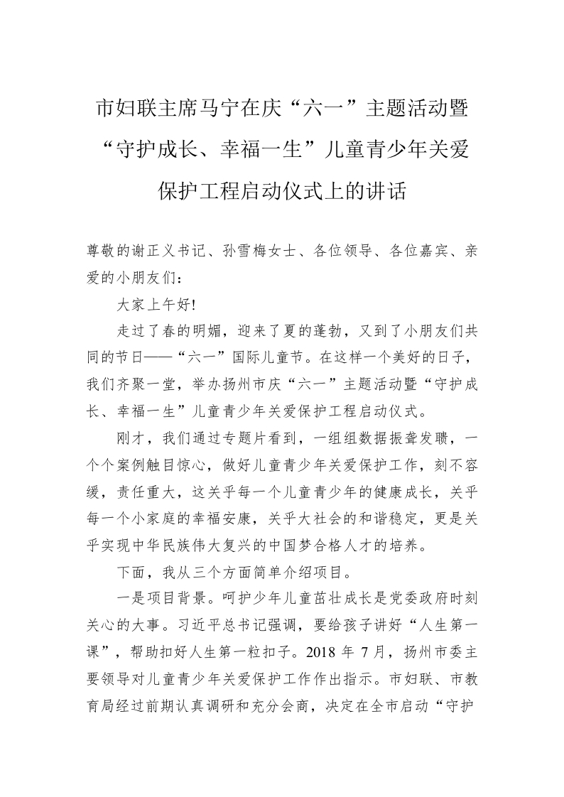/ 市妇联主席马宁在庆“六一”主题活动暨“守护成长、幸福一生”儿童青少年关爱保护工程启动仪式上的讲话