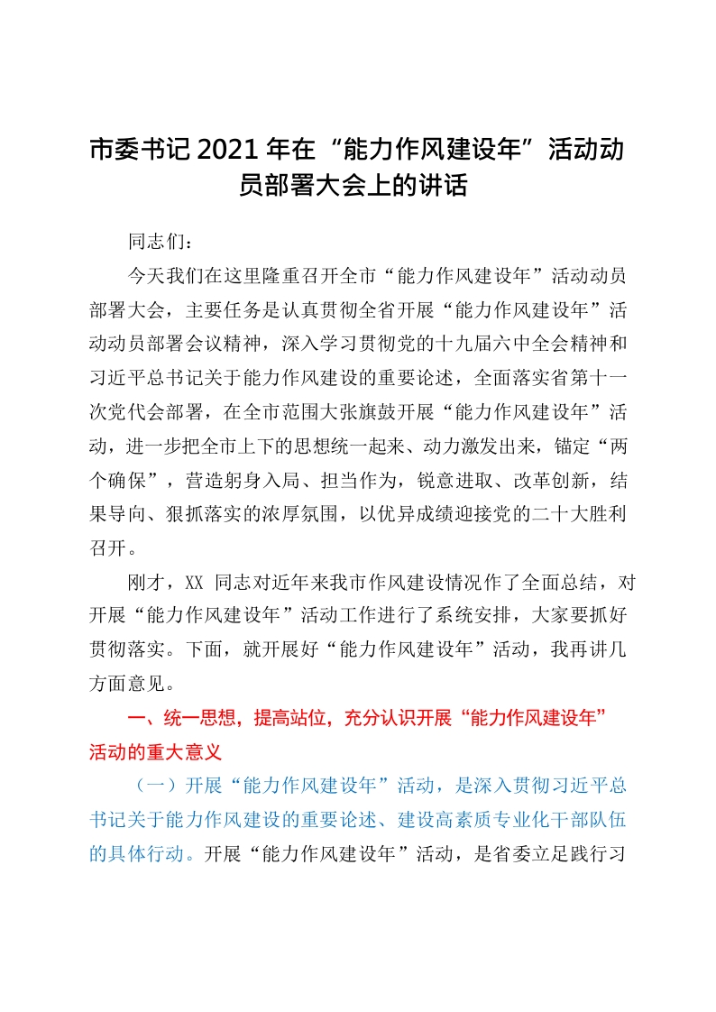 / 市委书记2021年在“能力作风建设年”活动动员部署大会上的讲话
