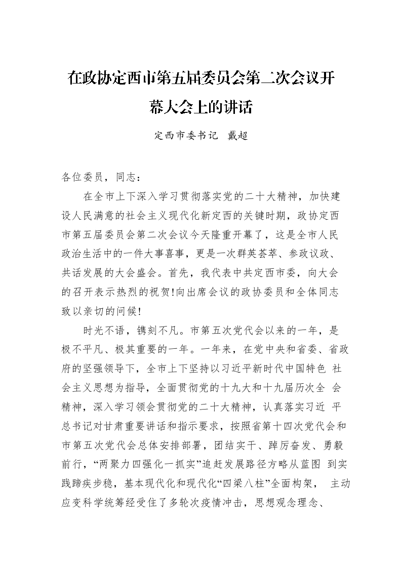 / 市委书记在政协定西市第五届委员会第二次会议开幕大会上的讲话(20221212)