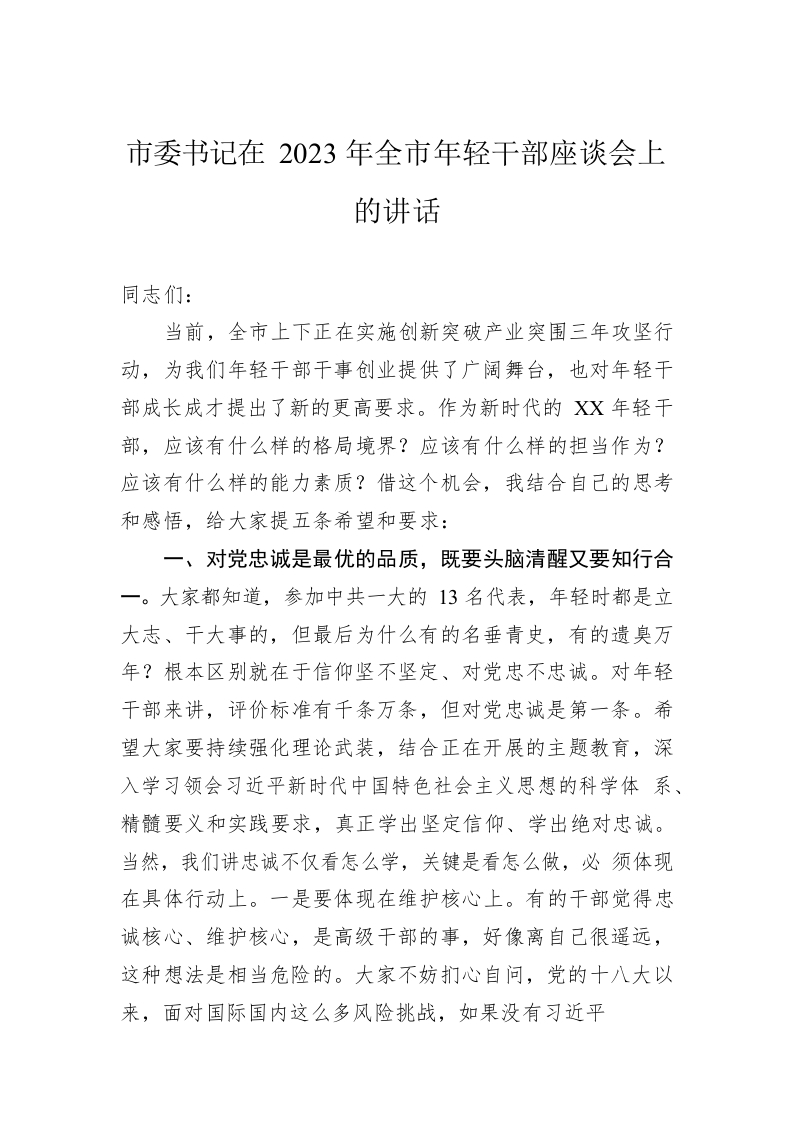 / 市委书记在2023年全市年轻干部座谈会上的讲话