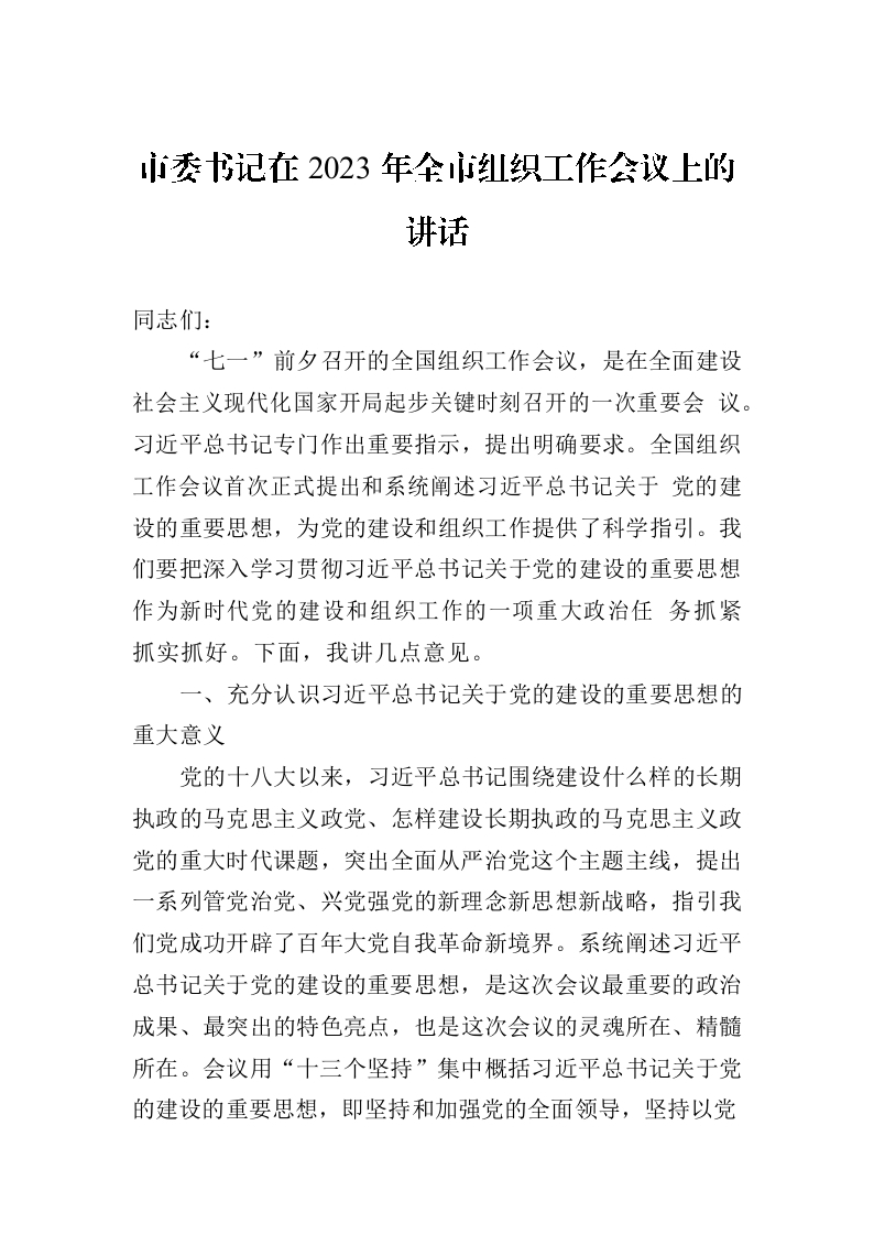 / 市委书记在2023年全市组织工作会议上的讲话