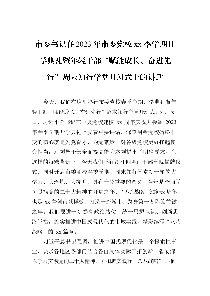 / 市委书记在2023年市委党校xx季学期开学典礼暨年轻干部“赋能成长、奋进先行”周末知行学堂开班式上的讲话