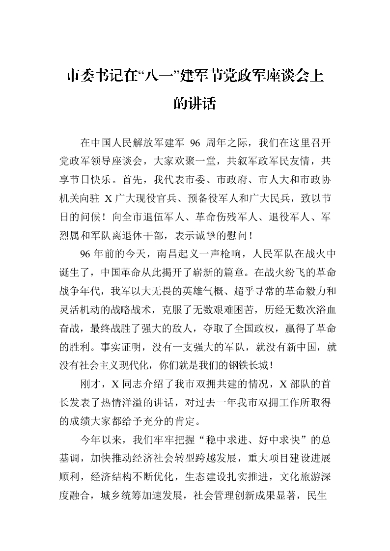 / 市委书记在“八一”建军节党政军座谈会上的讲话