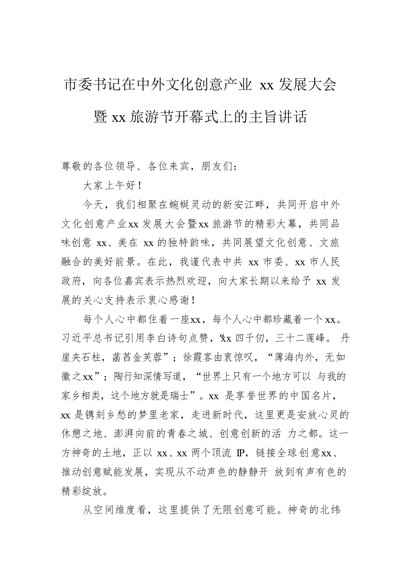 / 市委书记在中外文化创意产业xx发展大会暨xx旅游节开幕式上的主旨讲话