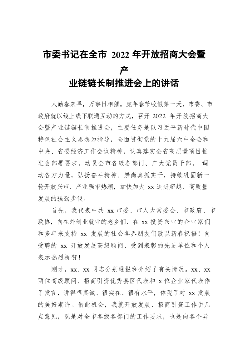 / 市委书记在全市2022年开放招商大会暨产业链链长制推进会上的讲话