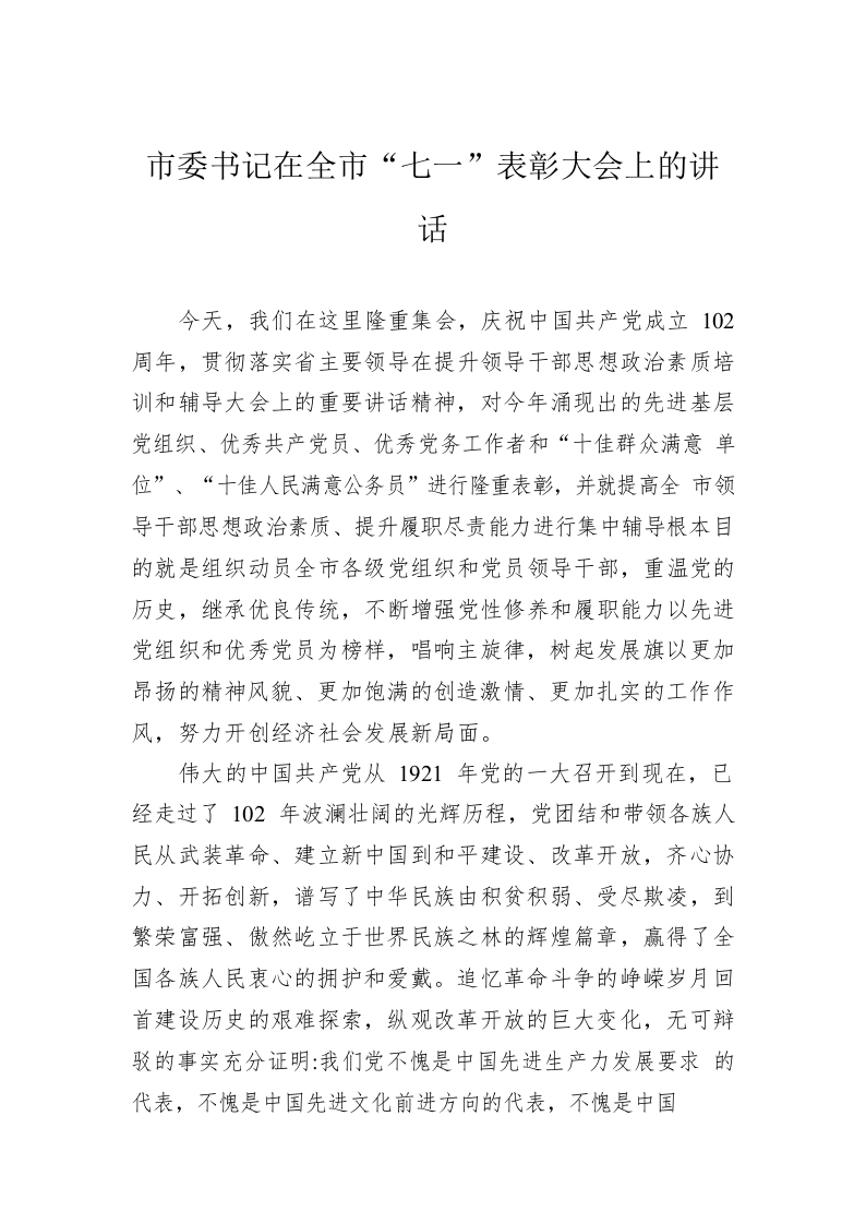 / 市委书记在全市“七一”表彰大会上的讲话