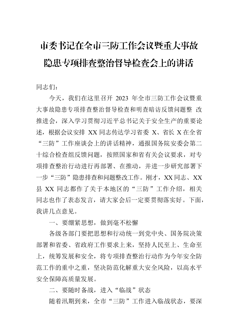 / 市委书记在全市三防工作会议暨重大事故隐患专项排查整治督导检查会上的讲话