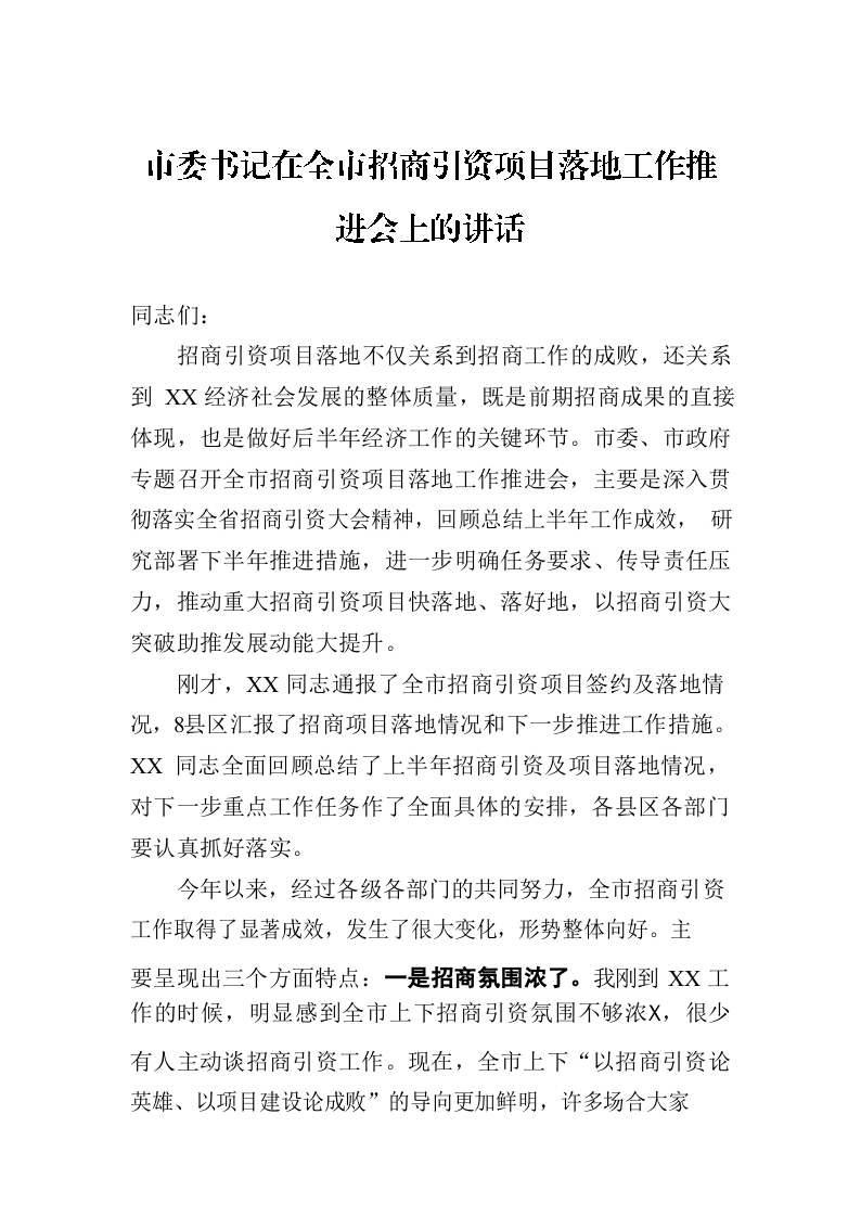 / 市委书记在全市招商引资项目落地工作推进会上的讲话