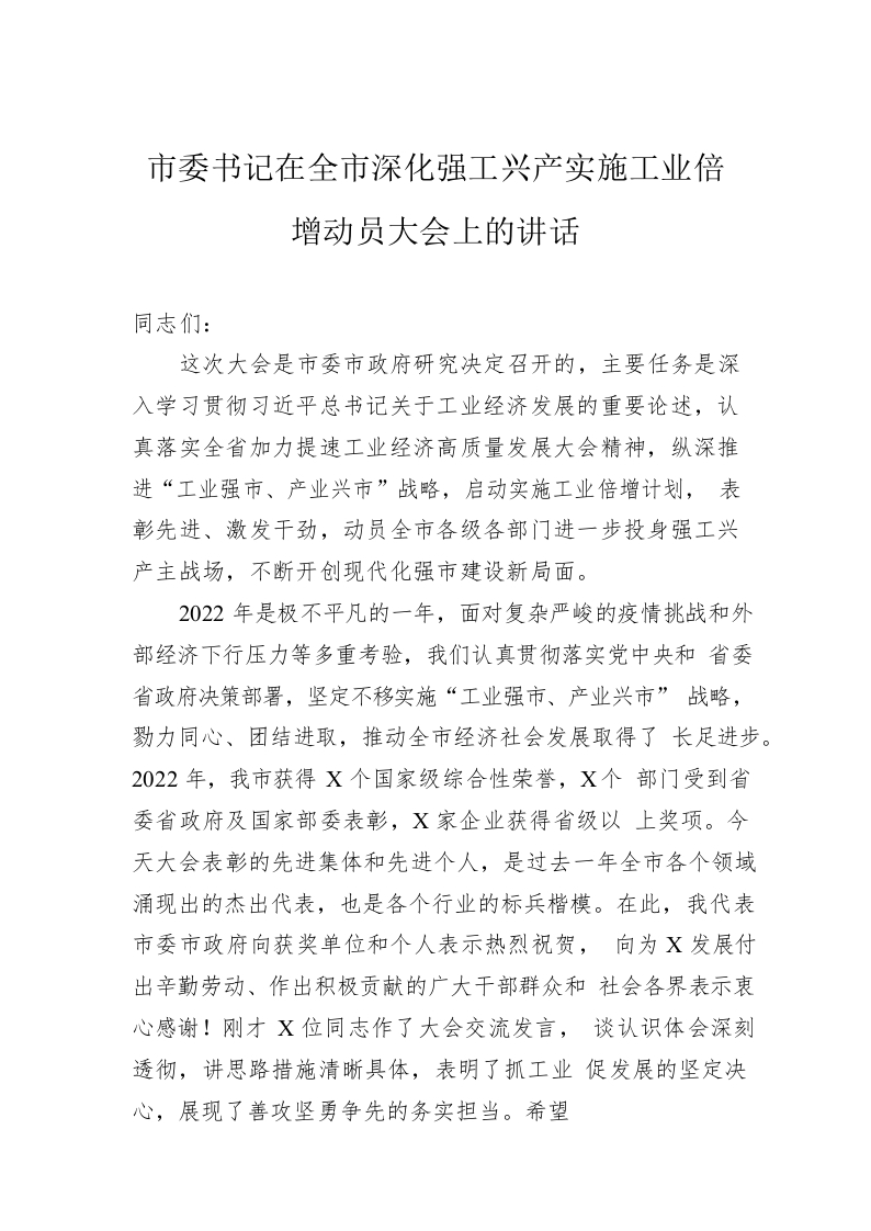 / 市委书记在全市深化强工兴产实施工业倍增动员大会上的讲话