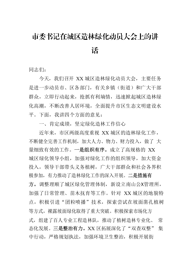 / 市委书记在城区造林绿化动员大会上的讲话