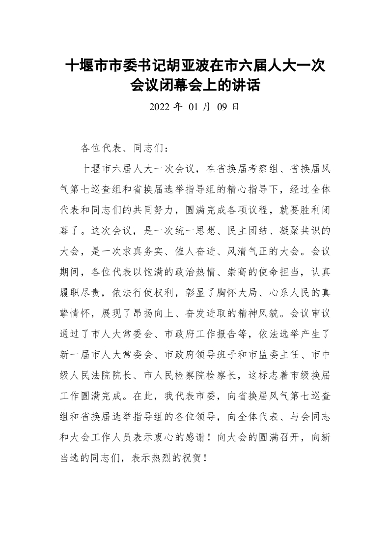 市委书记在市六届人大一次会议闭幕会上的讲话(20220330)