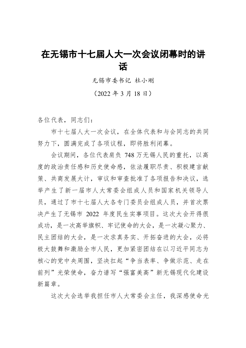 / 市委书记在市十七届人大一次会议闭幕时的讲话(20220318)