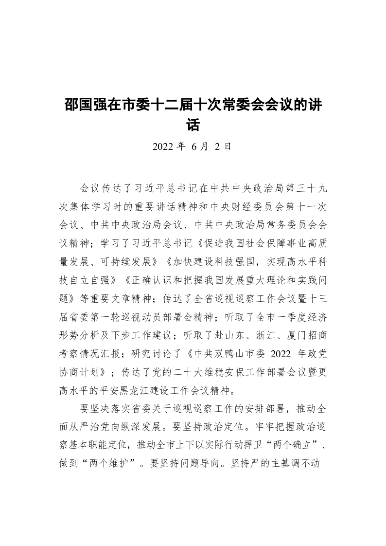 / 市委书记在市委十二届十次常委会会议的讲话(20220602)