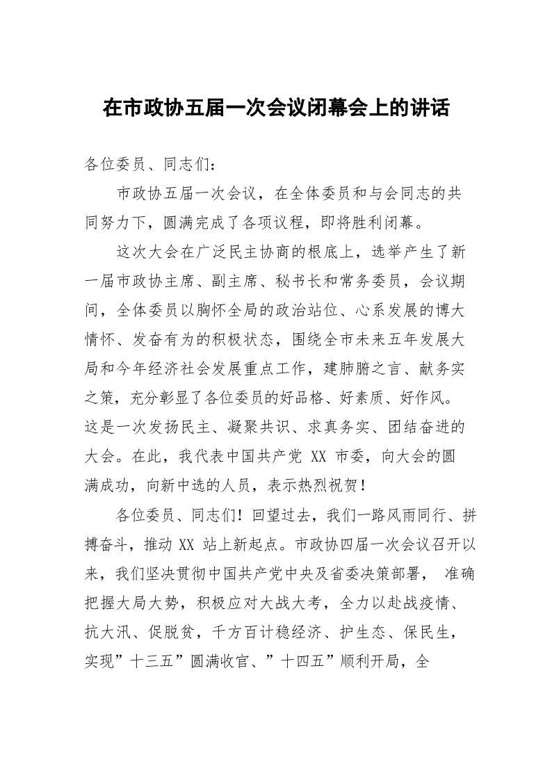 / 市委书记在市政协五届一次会议闭幕会上的讲话