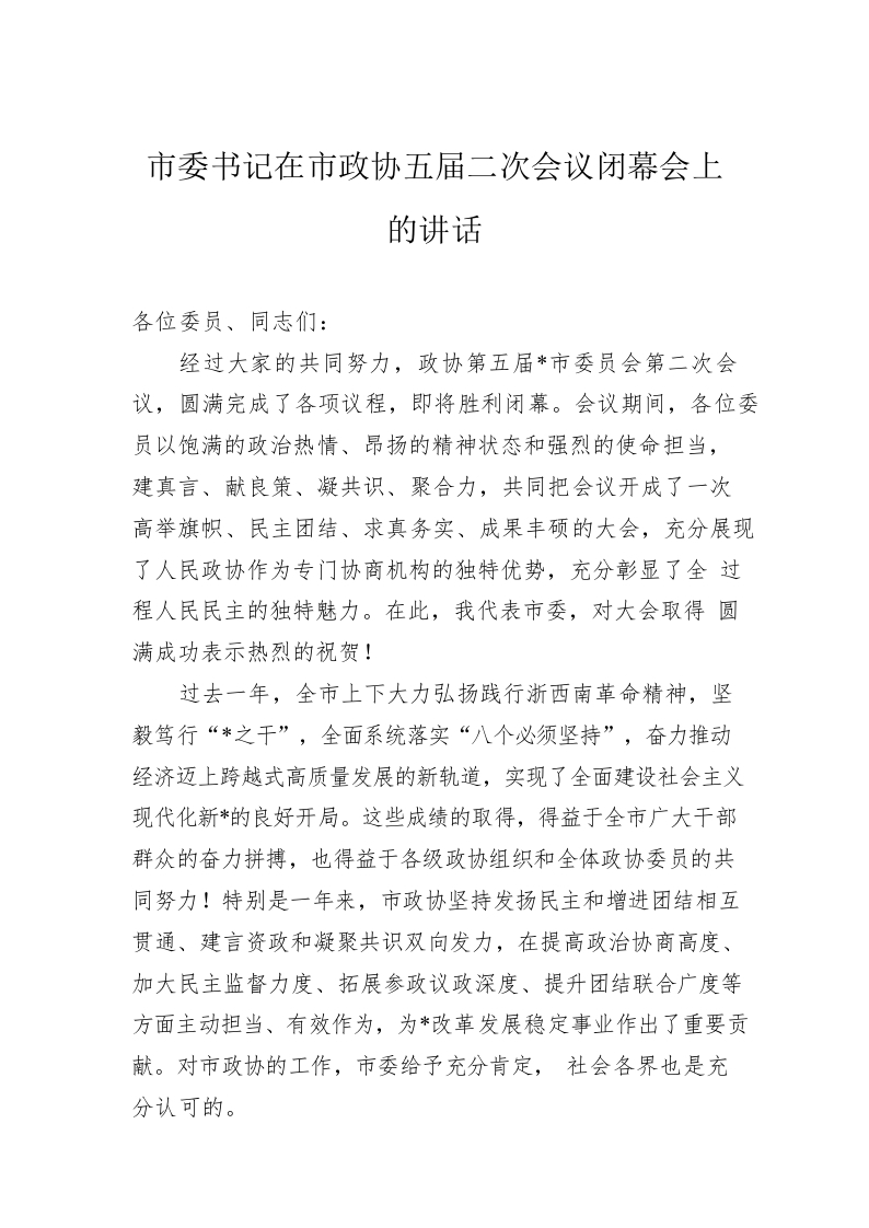 市委书记在市政协五届二次会议闭幕会上的讲话