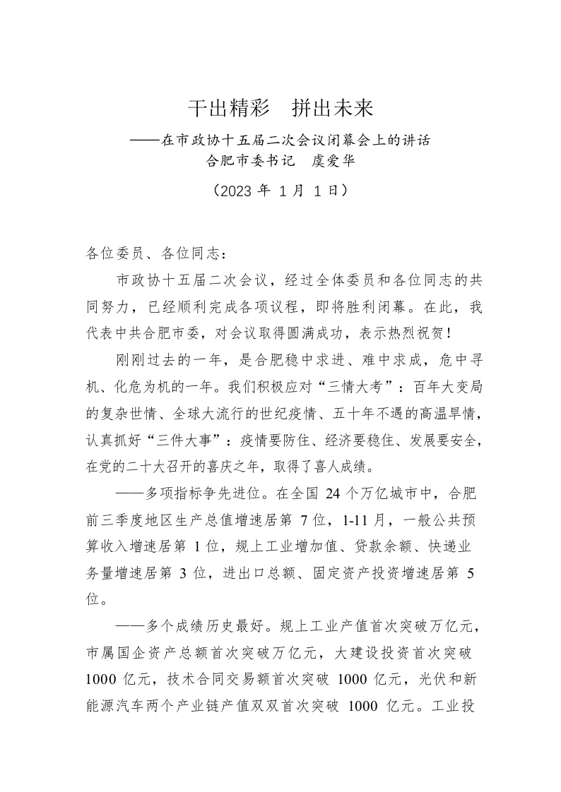 / 市委书记在市政协十五届二次会议闭幕会上的讲话(20230101)