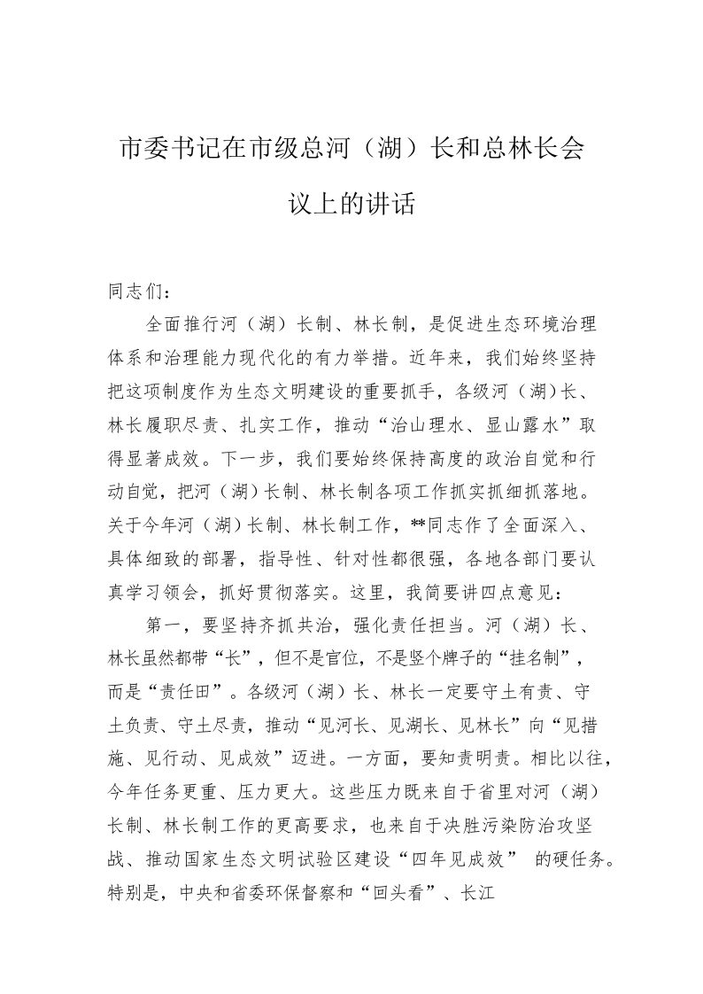 / 市委书记在市级总河(湖)长和总林长会议上的讲话