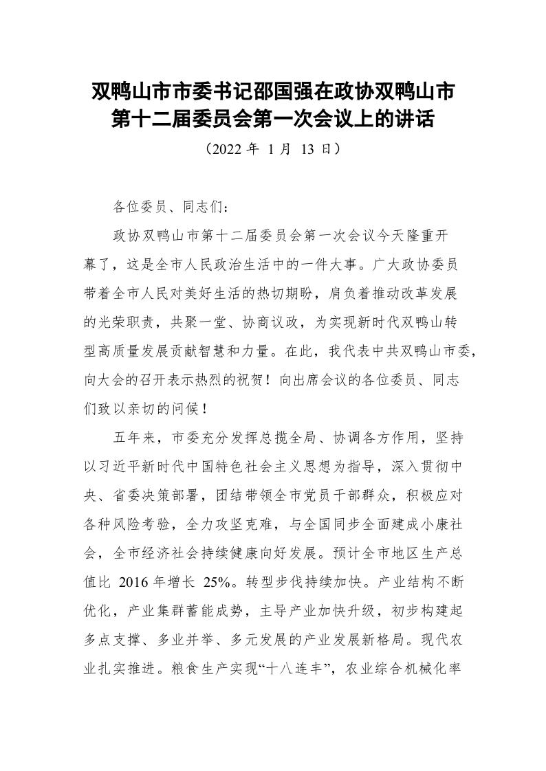 市委书记在政协市第十二届委员会第一次会议上的讲话