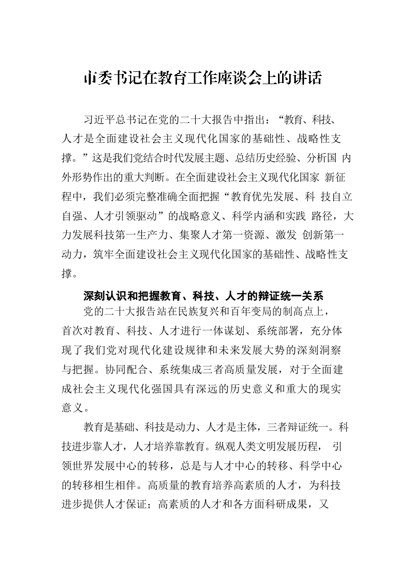 / 市委书记在教育工作座谈会上的讲话