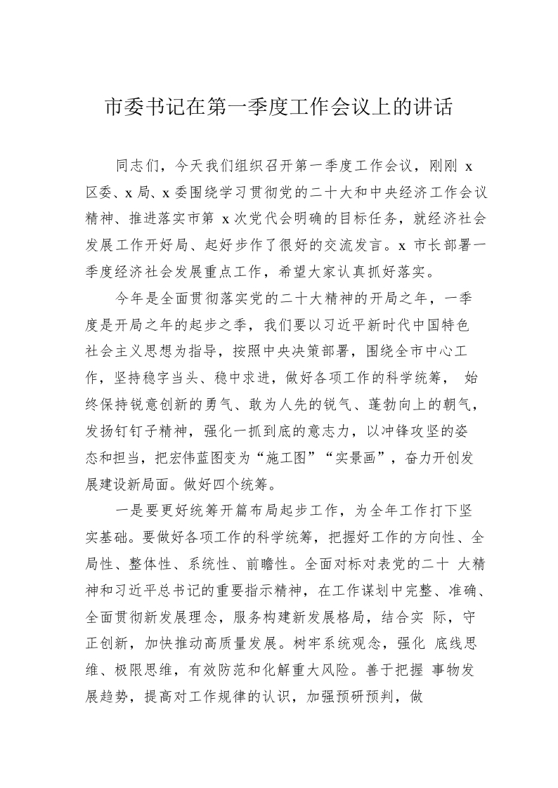 / 市委书记在第一季度工作会议上的讲话