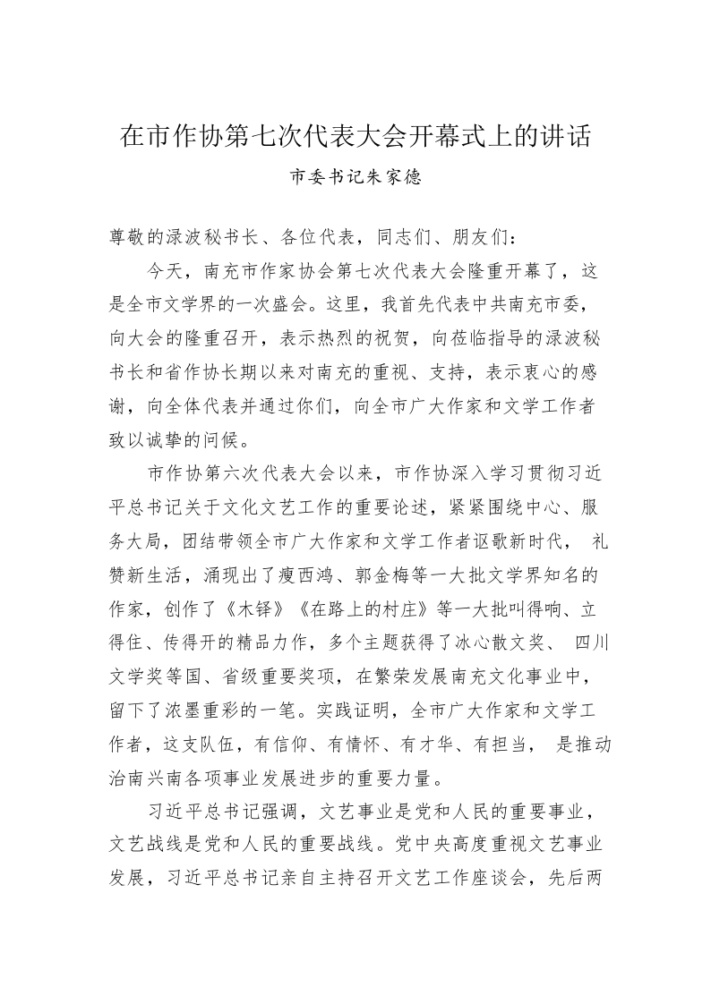市委书记朱家德:在市作协第七次代表大会开幕式上的讲话