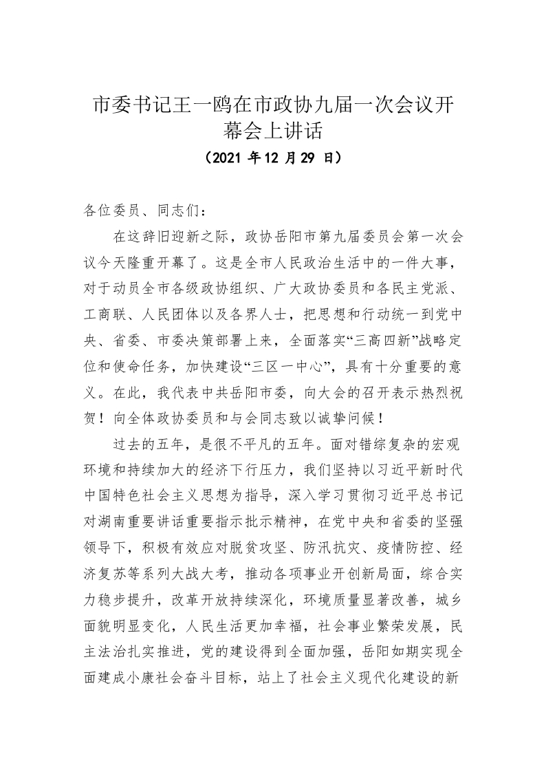 市委书记王一鸥在市政协九届一次会议开幕会上讲话(20211229)