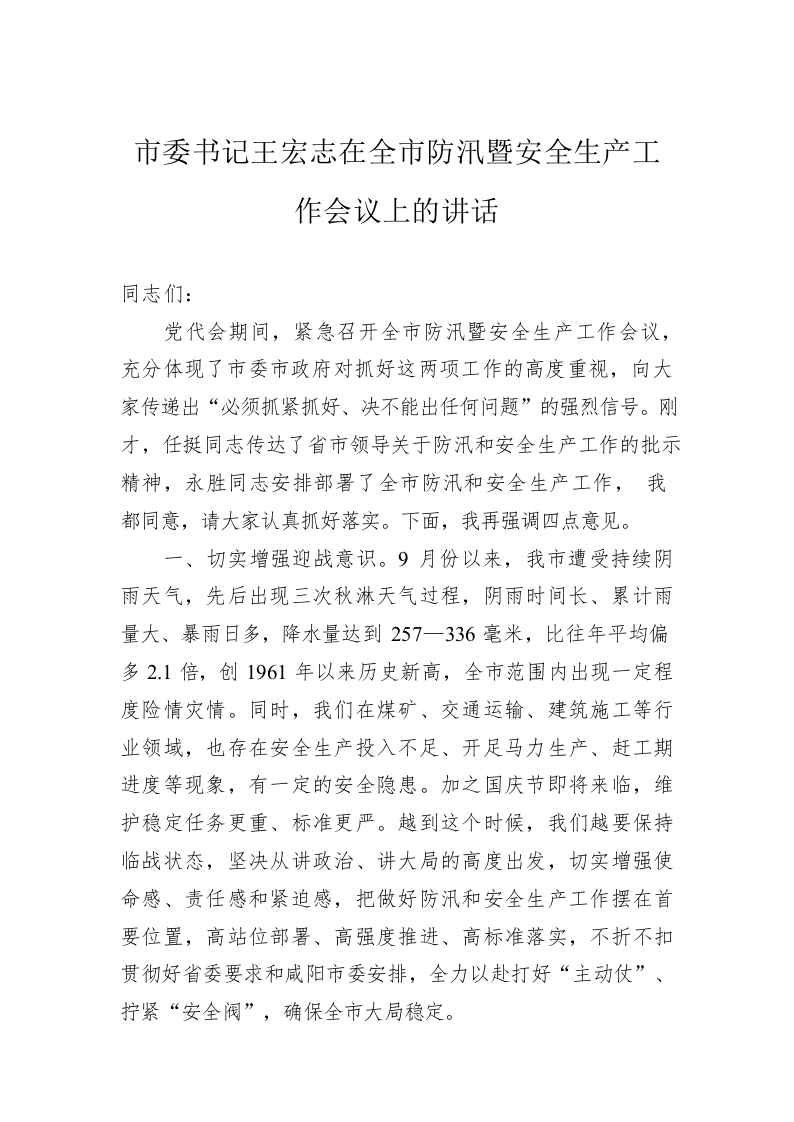 / 市委书记王宏志在全市防汛暨安全生产工作会议上的讲话