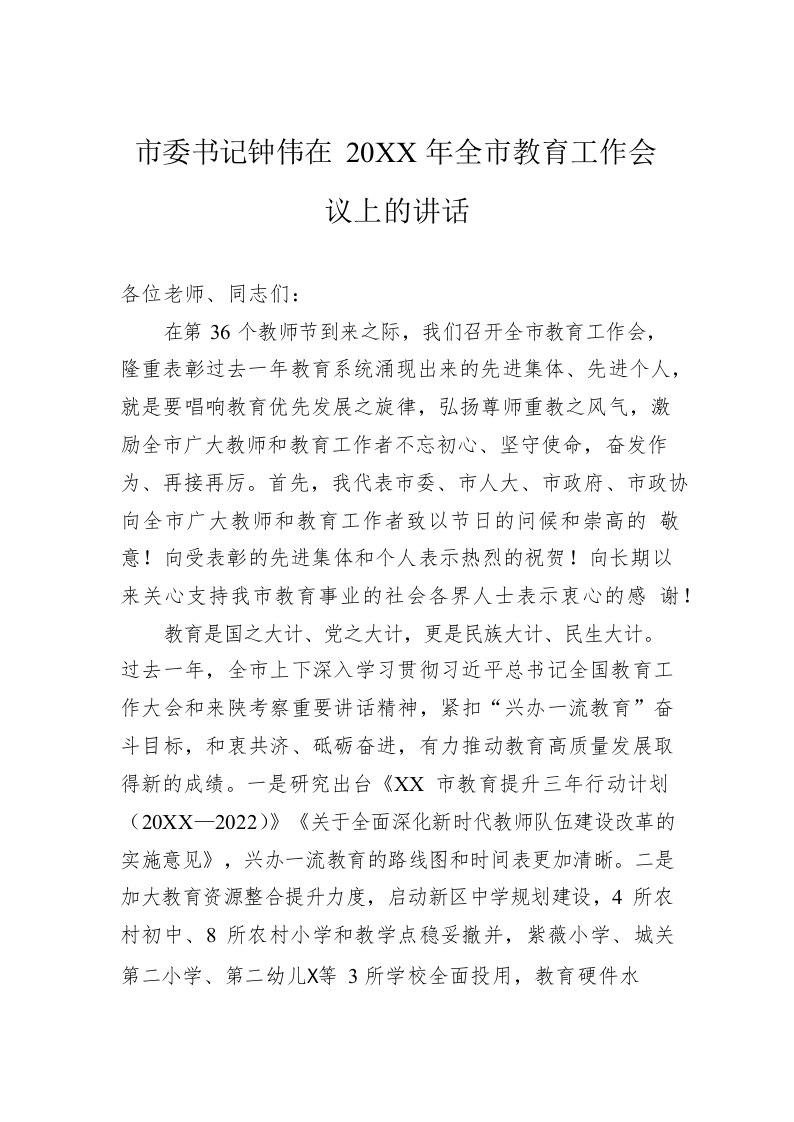 / 市委书记钟伟在20XX年全市教育工作会议上的讲话