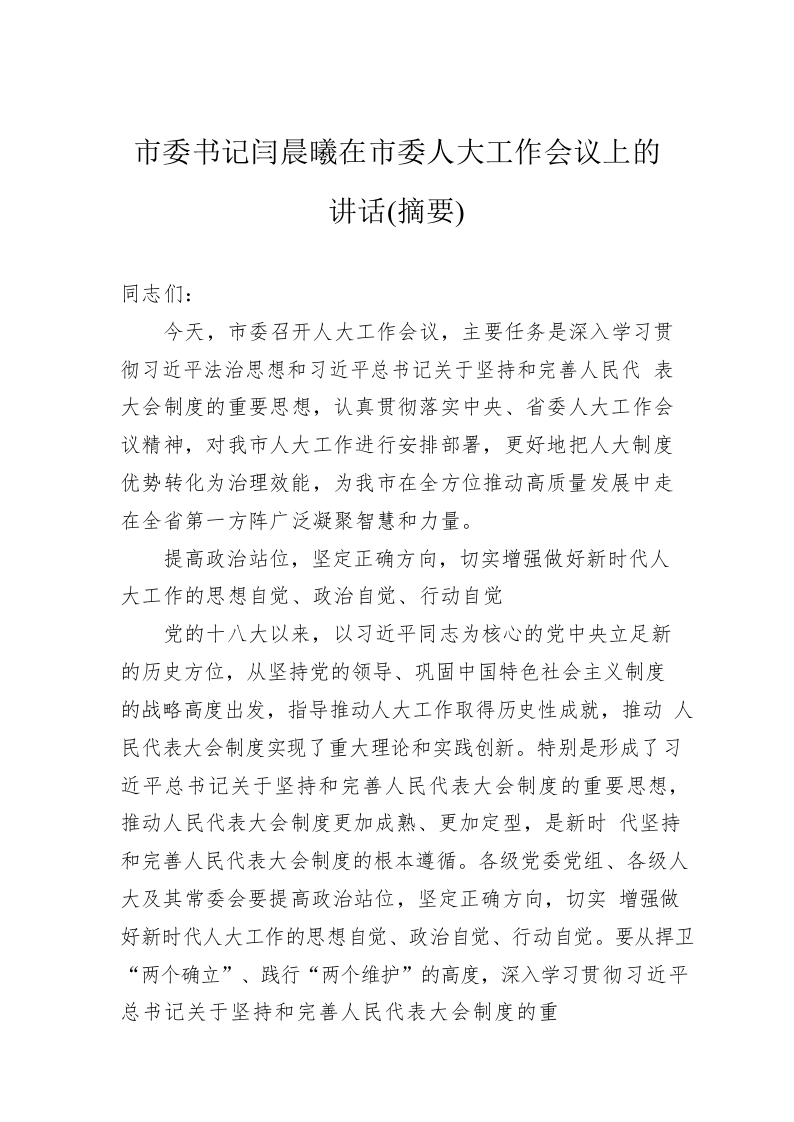 / 市委书记闫晨曦在市委人大工作会议上的讲话(摘要)(20220711)