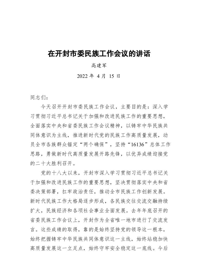 / 市委书记高建军在开封市委民族工作会议的讲话(20220415)