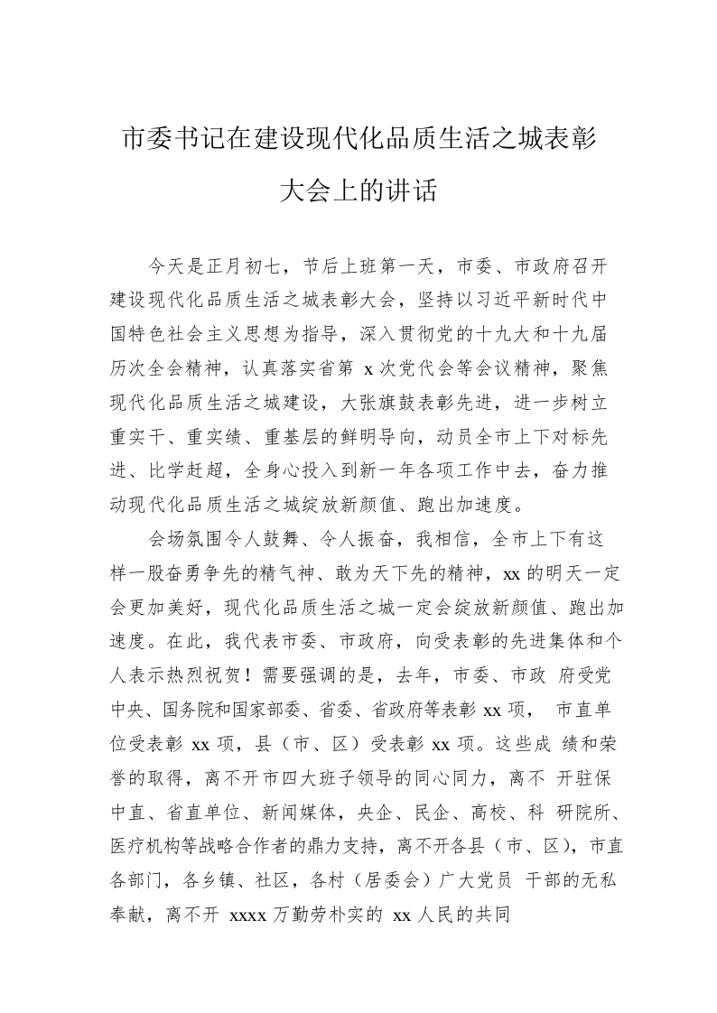 / 市委书记:在建设现代化品质生活之城表彰大会上的讲话