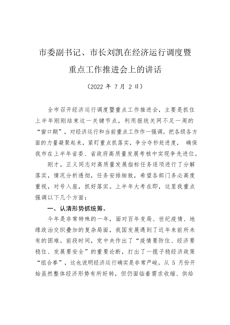 / 市委副书记、市长刘凯在经济运行调度暨重点工作推进会上的讲话(20220702)