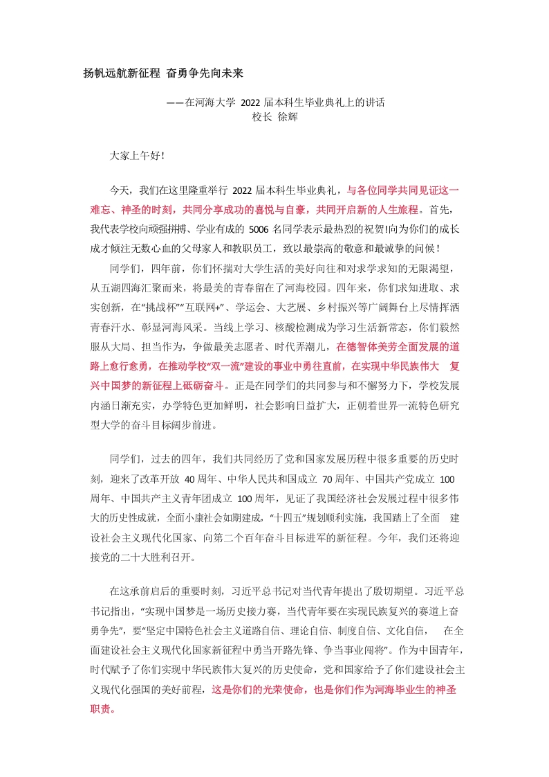 / 扬帆远航新征程 奋勇争先向未来——在河海大学2022届本科生毕业典礼上的讲话