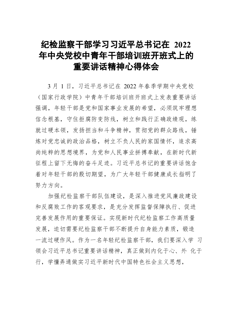 / 纪检监察干部学习习近平总书记在2022年中央党校中青年干部培训班开班式上的重要讲话精神心得体会