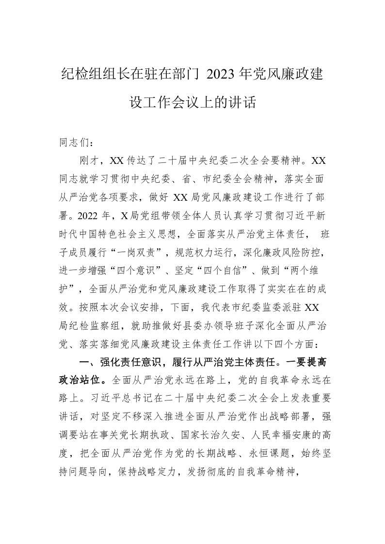 / 纪检组组长在驻在部门2023年党风廉政建设工作会议上的讲话