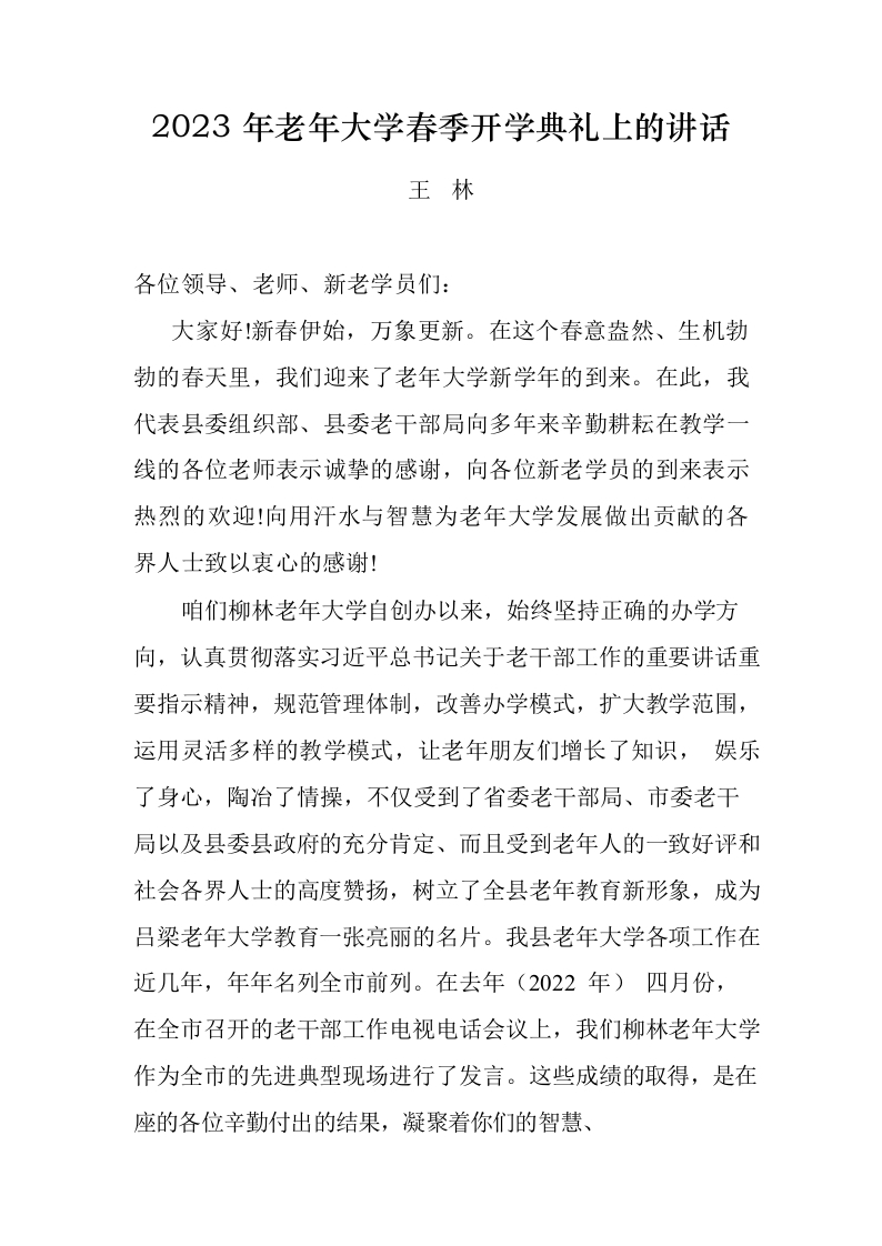 / 组织部副部长、老干部局局长在2023年老年大学春季开学典礼上的讲话