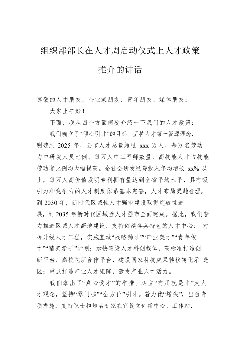 / 组织部部长在人才周启动仪式上人才政策推介的讲话