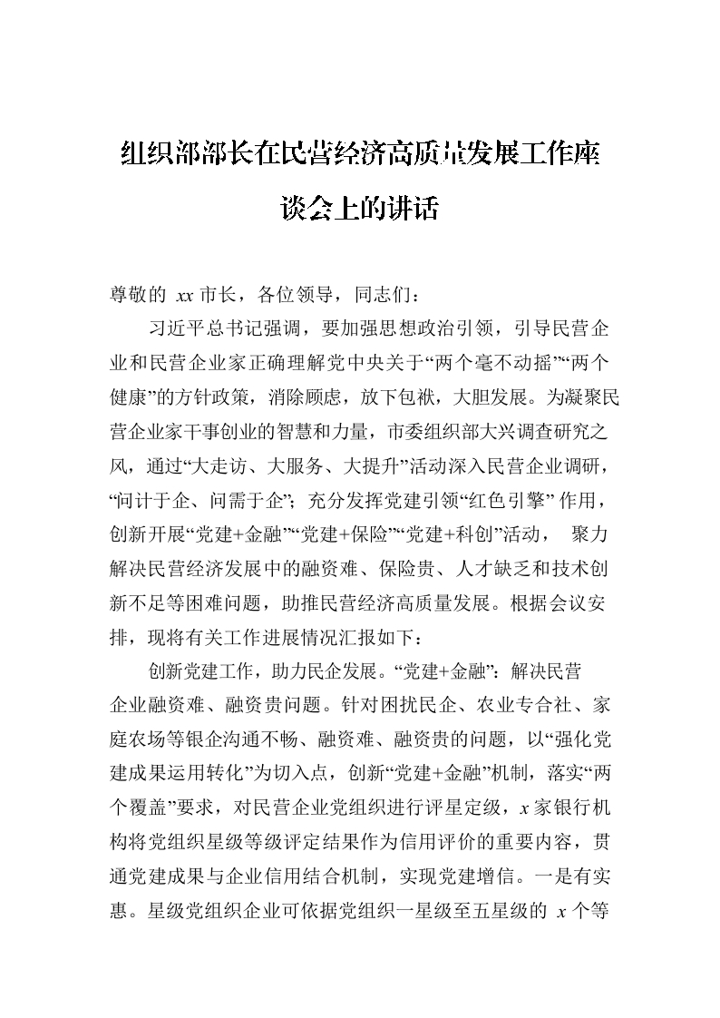 / 组织部部长在民营经济高质量发展工作座谈会上的讲话