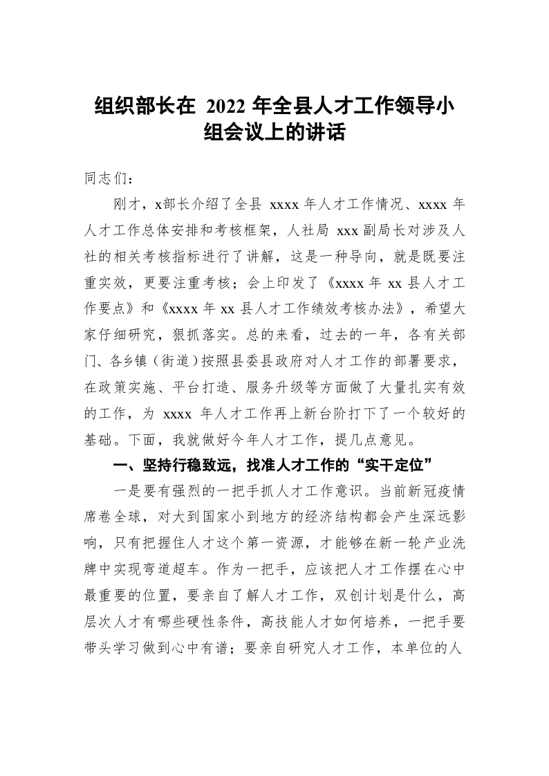 / 组织部长在2022年全县人才工作领导小组会议上的讲话