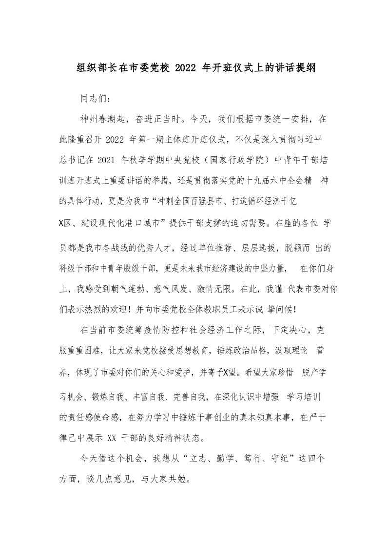 / 组织部长在市委党校2022年开班仪式上的讲话提纲