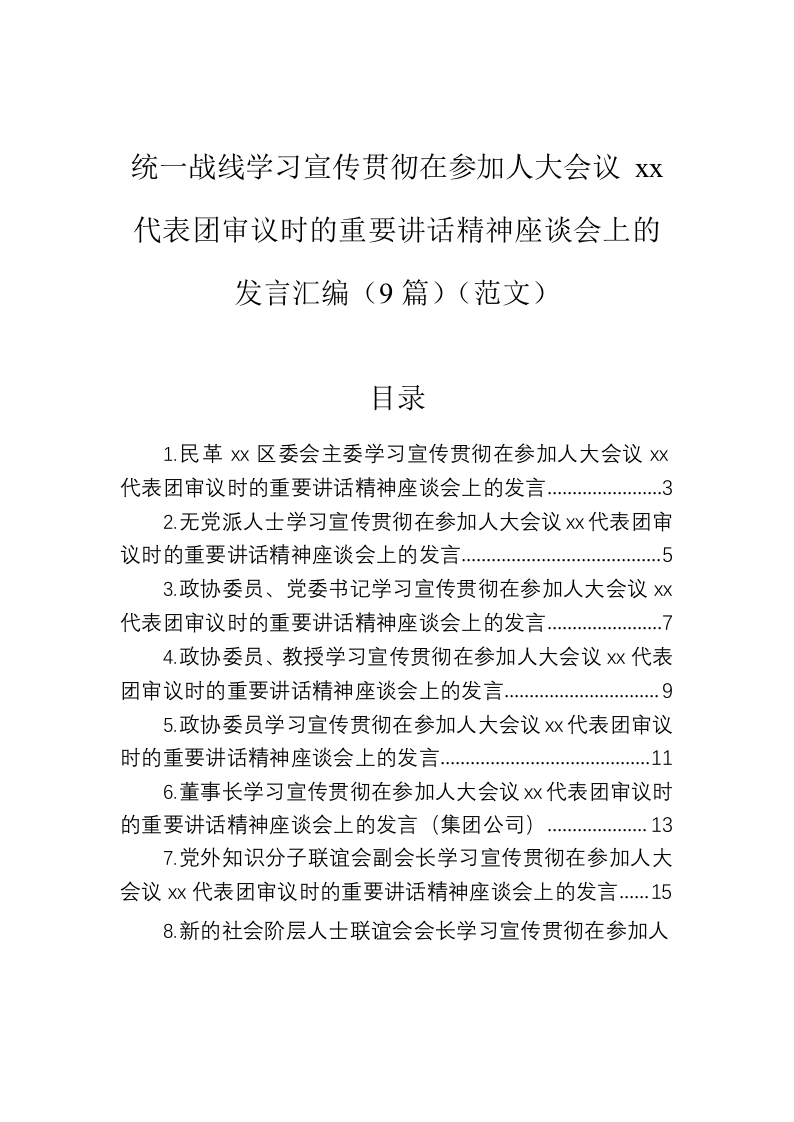 / 统一战线学习宣传贯彻在参加人大会议xx代表团审议时的重要讲话精神座谈会上的发言汇编(9篇)(范文)
