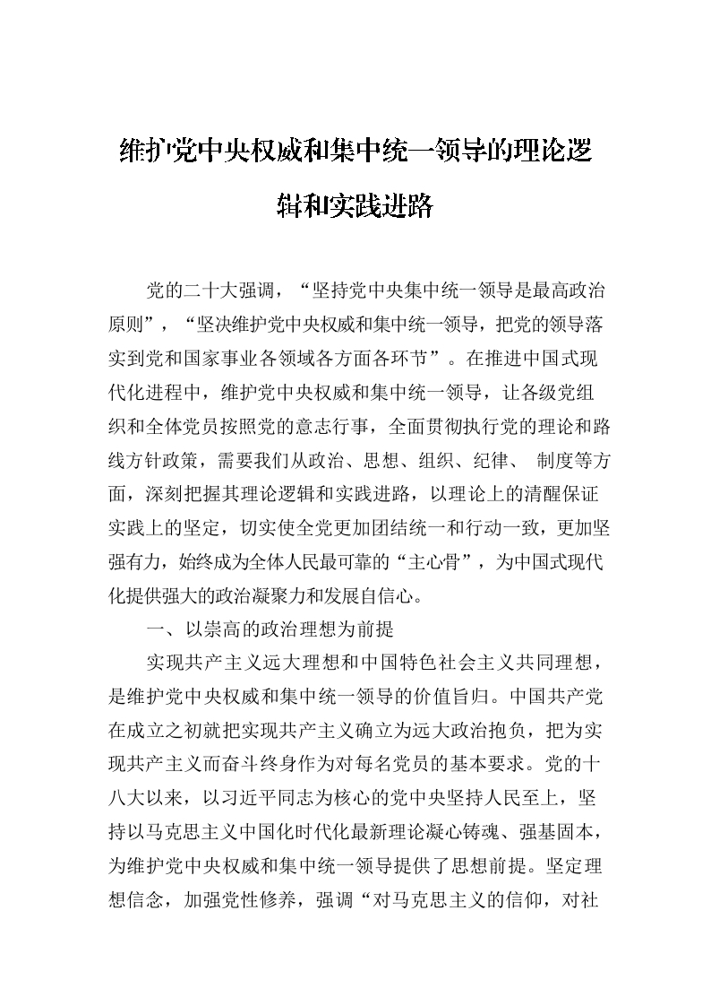 / 维护党中央权威和集中统一领导的理论逻辑和实践进路