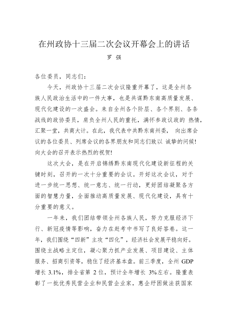 / 罗强:在州政协十三届二次会议开幕会上的讲话(20221229)