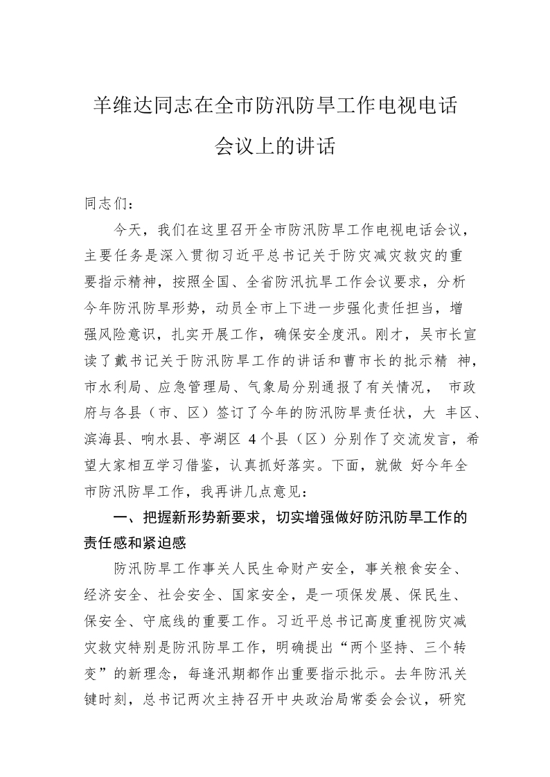 / 羊维达同志在全市防汛防旱工作电视电话会议上的讲话